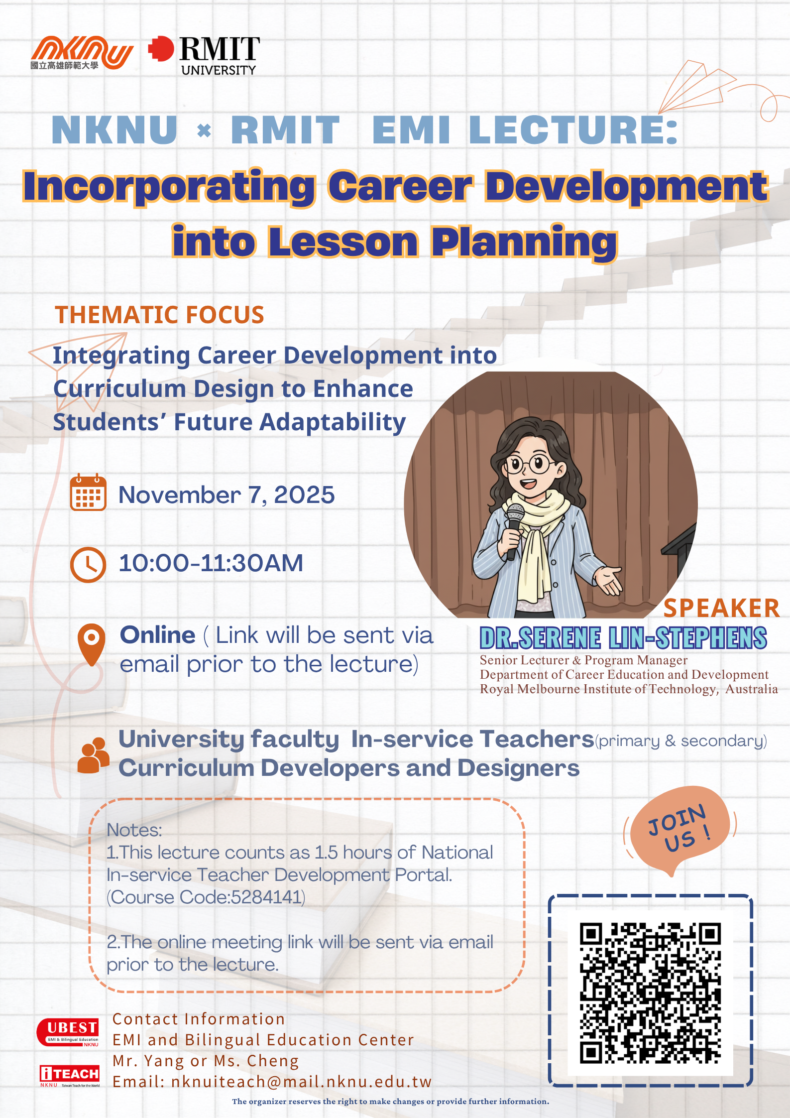 國立高雄師範大學與澳洲皇家墨爾本理工大學(RMIT University)合作辦理「NKNU × RMIT EMI Lecture: Incorporating Career Development into Lesson Planning」線上講座