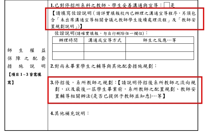 - 新增要求檢附「教師安置輔導相關規劃與說明」作為佐證資料之一