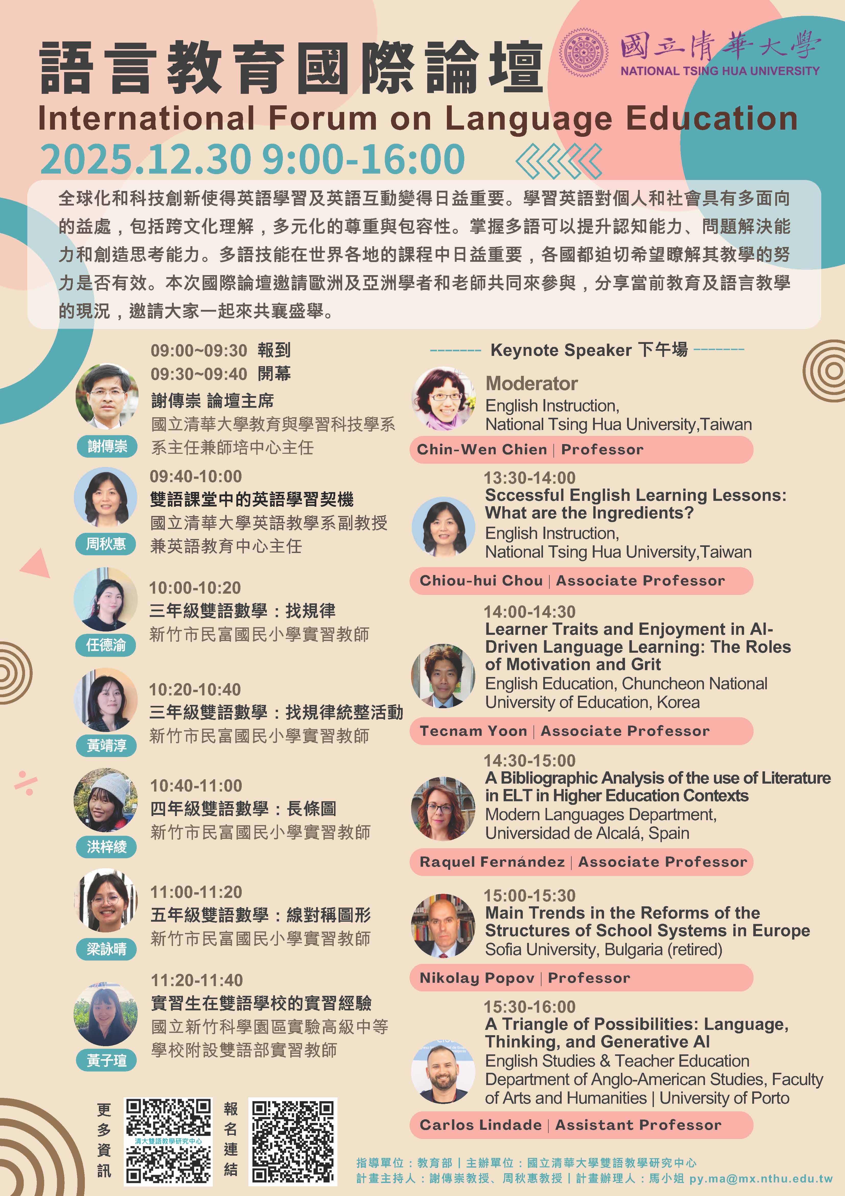 二、論壇主席:謝傳崇教授。上午場主持人:周秋惠副教授,下午場主持人:簡靜雯教授。與談人:周秋惠副教授、任德渝老師、黃靖淳老師、洪梓綾老師、梁詠晴老師、黃子瑄老師、Tecnam Yoon副教授、Raquel Fernández助理教授、Nikolay Popov教授、Carlos Lindade助理教授。