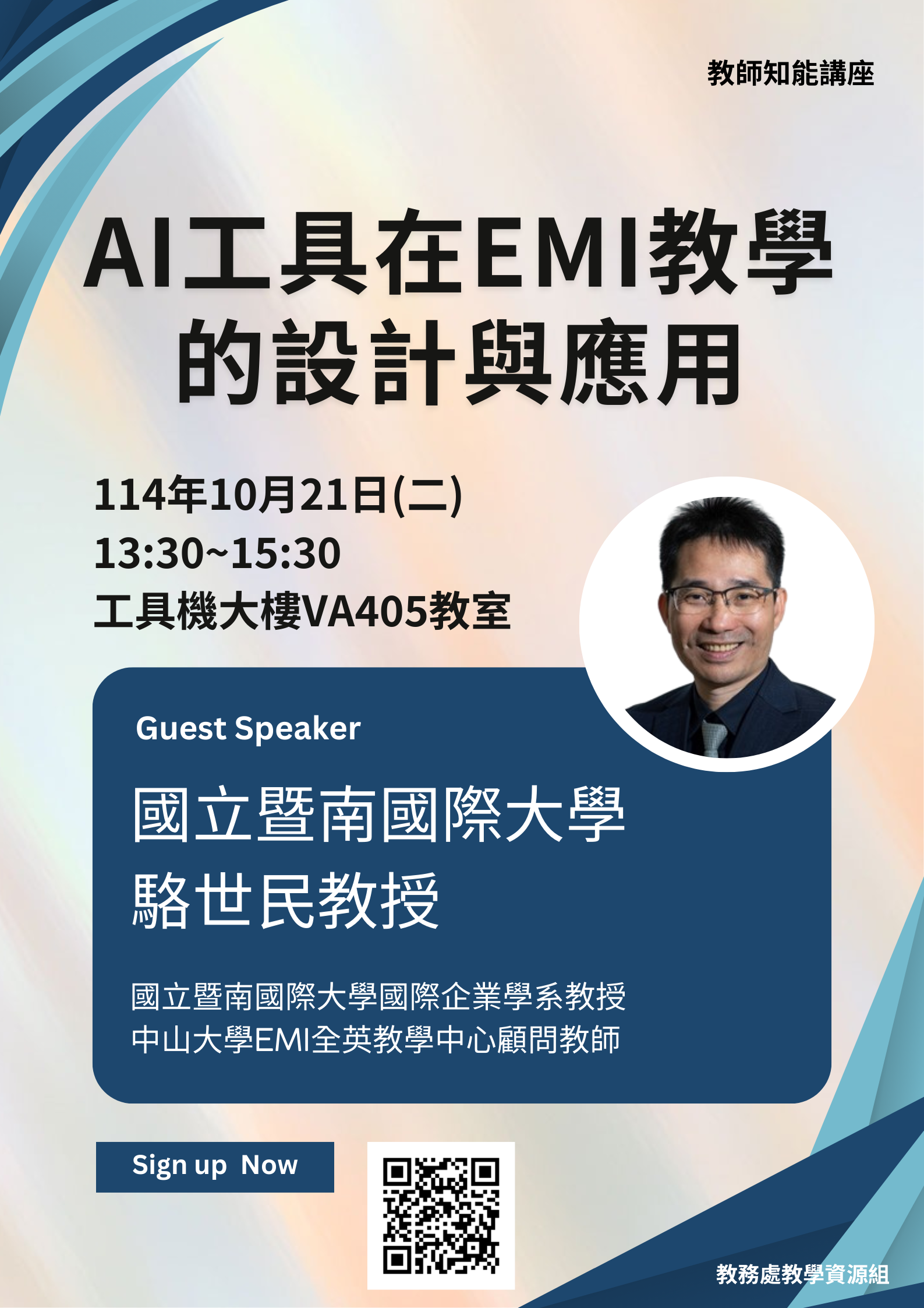 ・主講人簡介:現任國立暨南國際大學國際企業學系專任教授、兼任臺師大EMBA中山大學EMI全英教學中心顧問教師;曾四度榮獲全校教學獎;撰寫技術報告「促成大學生自主學習以直接面向未來的全面性創新教學-以GenAI與數位科技融入EMI課程設計與課堂經營(2024)」;近兩年受邀於全國24所大學AI-EMI培訓或演講,經驗豐富。