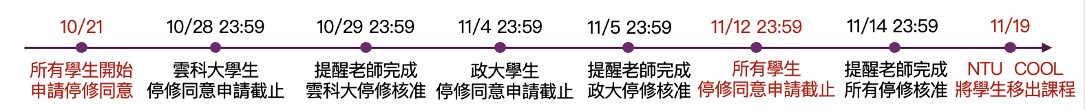 3.申請名單整理:本校教務處課務組將於12/16(二)向 NTU COOL 回報停修、退選名單。